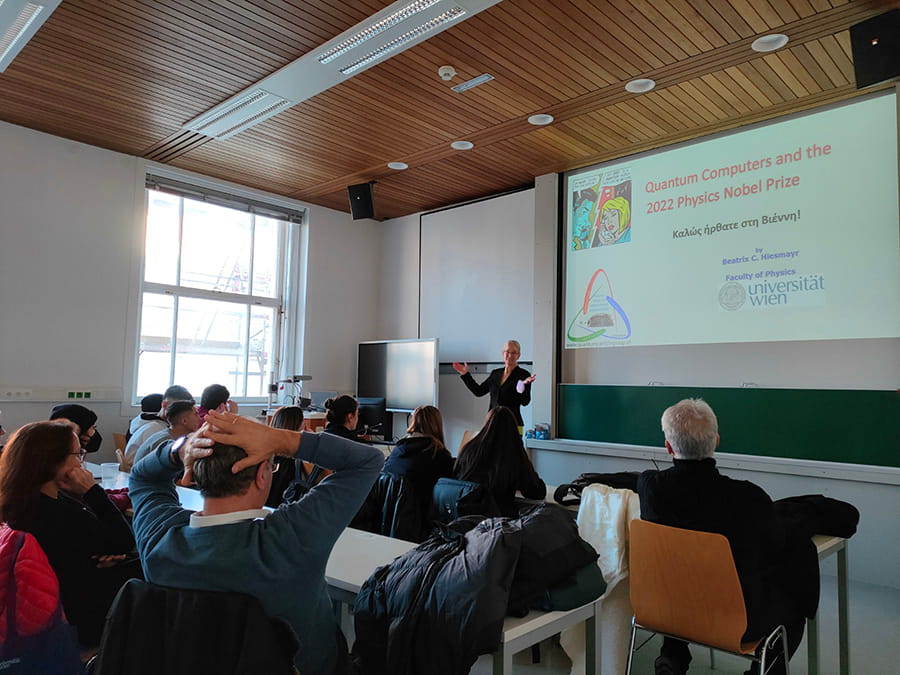 Η 2η διάλεξη με θέμα «Κβαντικοί Υπολογιστές και το Βραβείο Νόμπελ Φυσικής του 2022» έγινε από τη Dr. Beatrix Hiesmayr. Σε μια εξαιρετική παρουσίαση, στην οποία χρησιμοποιήθηκαν εκτός από τις αγγλικές και πολλές ελληνικές λέξεις, η Dr. Beatrix Hiesmayr αναφέρθηκε στο Βραβείο Νόμπελ Φυσικής του 2022, το οποίο μοιράστηκε ο καθηγητής του Πανεπιστημίου της Βιέννης Prof. Dr. Anton Zeilinger με άλλους δύο επιστήμονες, Alain Aspect, John F. Clauser. Καθένας από τους τρεις έχει διεξάγει πρωτοποριακά πειράματα, χρησιμοποιώντας διεμπλεγμένες κβαντικές καταστάσεις, όπου δύο σωματίδια συμπεριφέρονται σαν μια ενιαία μονάδα, ακόμα και όταν είναι διαχωρισμένα. Τα αποτελέσματα των πειραμάτων τους έχουν ανοίξει το δρόμο για τη νέα τεχνολογία, που βασίζεται σε κβαντικές πληροφορίες.