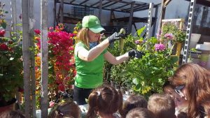 Η γεωπόνος τους έδειξε πολλά δέντρα και φυτά, τους μίλησε για τα στάδια ανάπτυξης των φυτών και για τον τρόπο που πρέπει να τα φροντίζουμε στο σπίτι μας. Στη συνέχεια οι μαθητές έμαθαν βιωματικά τη διαδικασία της μεταφύτευσης και πήραν από ένα δικό τους φυτό.