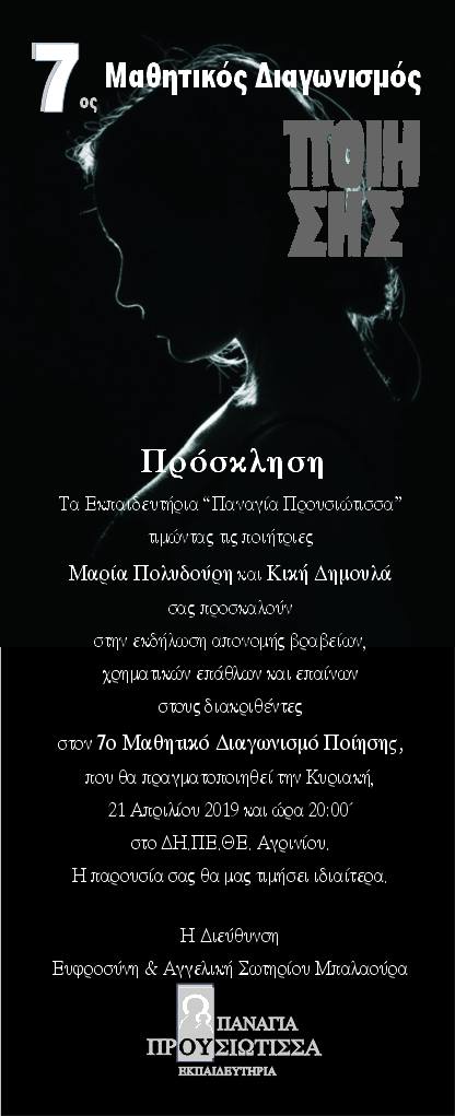 Ο 7ος Μαθητικός Διαγωνισμός Ποίησης των Εκπαιδευτηρίων «Παναγία Προυσιώτισσα» , ήταν φέτος αφιερωμένος στις ποιήτριες Μαρία Πολυδούρη και Κική Δημουλά και ολοκληρώθηκε σε μια όμορφή τελετή, στην αίθουσα του ΔΗ.ΠΕ.ΘΕ. Αγρινίου, την Κυριακή, 21 Απριλίου 2019. Βραβεύτηκαν οι διακριθέντες μαθητές από όλο τον νομό, δραματοποιήθηκαν επί σκηνής ποιήματα των δύο ποιητριών και τραγούδησε η χορωδία των Εκπαιδευτηρίων. Στον διαγωνισμό συμμετείχε μεγάλος αριθμός μαθητών από Δημοτικά, Γυμνάσια και Λύκεια όλου του Νομού Αιτωλοακαρνανίας. Απονεμήθηκαν συνολικά 6 βραβεία με χρηματικά έπαθλα και 9 έπαινοι με δώρα βιβλία ποίησης, τα οποία κατανεμήθηκαν ως εξής: