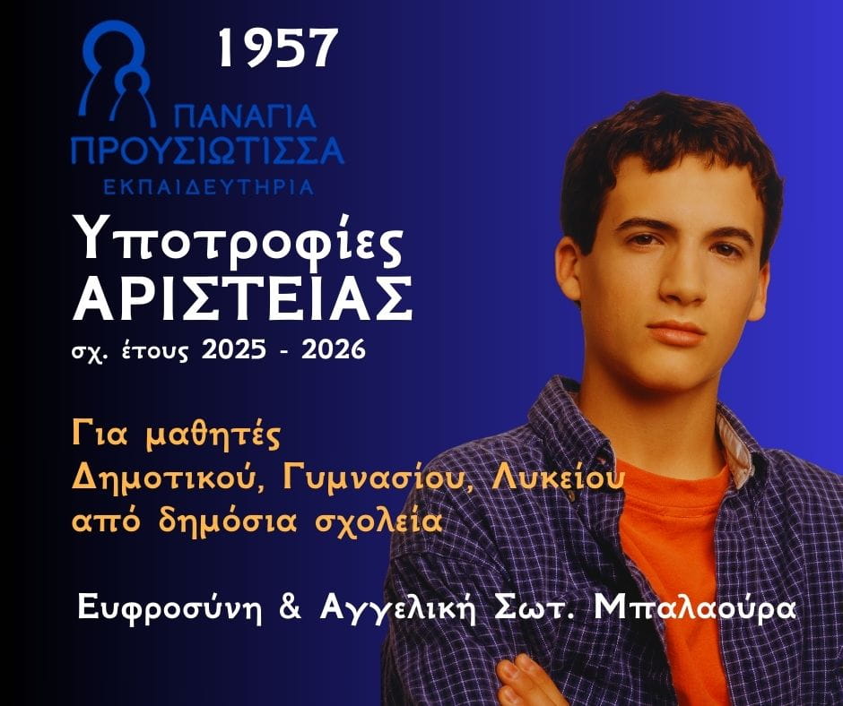 Ενισχύουμε την προσπάθεια – Επιβραβεύουμε την αριστεία. Τα Εκπαιδευτήρια Παναγία Προυσιώτισσα από το 1957 επιδιώκουν, επιτυγχάνουν και επιβραβεύουν την Αριστεία. Για τον λόγο αυτό προχώρησαν στην ίδρυση Ταμείου Υποτροφιών, ώστε να χορηγήσουν Υποτροφίες Αριστείας από το σχολικό έτος 2025-2026 σε μαθητές δημοσίων σχολείων. Αυτές οι υποτροφίες αφορούν σε μαθητές που το 2025-2026 θα φοιτήσουν σε: Ε΄και ΣΤ Δημοτικού – Γυμνάσιο – Λύκειο. Οι γονείς των υπότροφων μαθητών καλύπτουν το 50% των ετήσιων διδάκτρων και τα έξοδα μεταφοράς με το σχολικό λεωφορείο, εφόσον το έχουν επιλέξει. Οι υποτροφίες συνεχίζουν να χορηγούνται – εφόσον πληρούνται τα κάτωθι κριτήρια αξιολόγησης – έως το τέλος της βαθμίδας, στην οποία αρχικά έκαναν εγγραφή οι υπότροφοι. — Ακαδημαϊκή επίδοση Α) Συμπλήρωση της ηλεκτρονικής αίτησης. Β) Ορισμός διά ζώσης συνάντησης με τους γονείς και τον υποψήφιο υπότροφο μαθητή κατά την οποία θα προσκομισθούν τα κάτωθι δικαιολογητικά. — Φωτοτυπία Αναλυτικής Βαθμολογίας του τελευταίου σχολικού έτους. ΥΠΟΤΡΟΦΙΕΣ ΑΡΙΣΤΕΙΑΣ